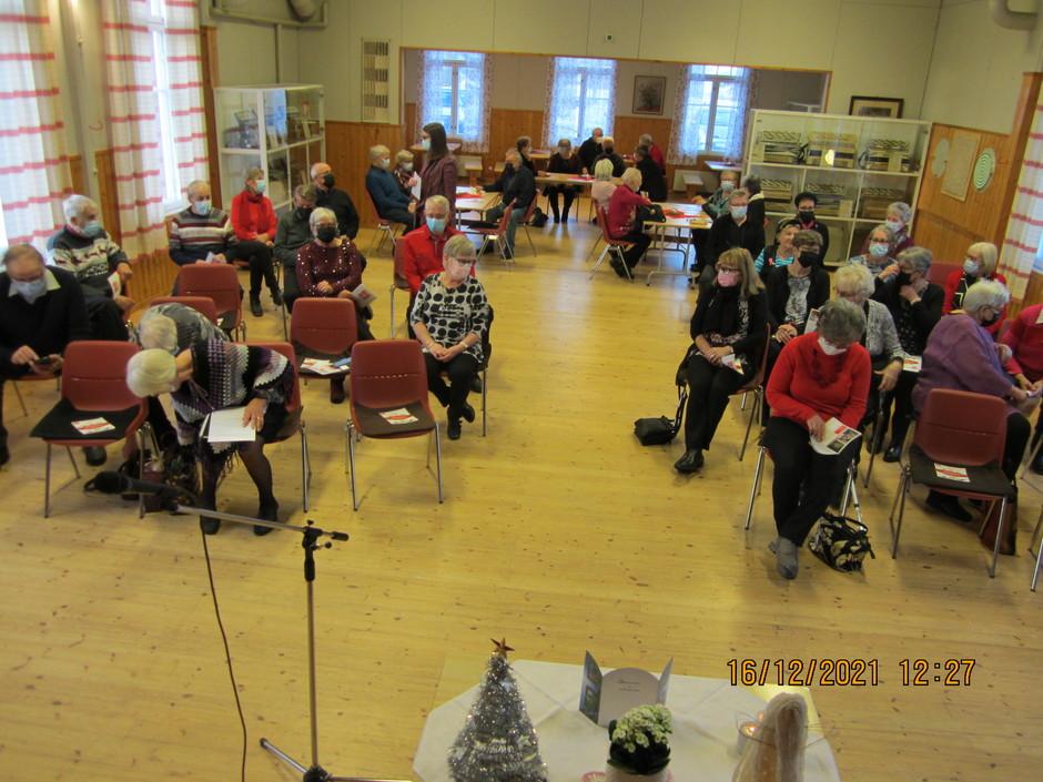 Eläkkeensaajien syyskausi päättyi Jouluhartauteen torstaina 16.12.2021. Seurakunnasta mukana oli Mari Saikkonen. Lisäksi oli omaa ohjelmaa. Sirkka Mäki- Paavola luki jouluevankeliumin, Eläkkeensaajien naiskuoro lauloi ja Helena Kuusisto lausui runon. Jouluhartauden jälkeen oli tarjolla torttukahvit. Hartaustilaisuuteen osallistui runsaat neljäkymmentä henkeä.