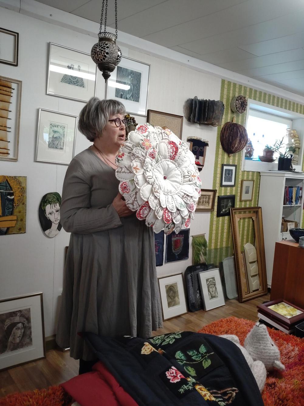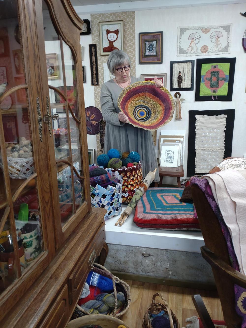 Ke 31.5. tutustuimme Eija Pöyryn käsityönavettaan Miedossa. Hän valmistaa kierrätys materiaaleista tyynyjä, tauluja, laukkuja, peittoja, tossuja jne. Tekee keramiikkatöitä ja kirjansidontaa. Kuvat kertovat enemmän.