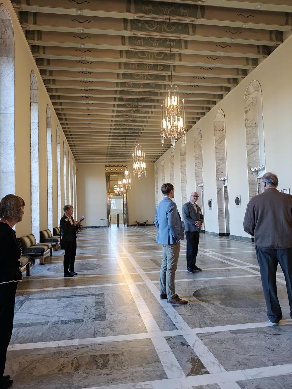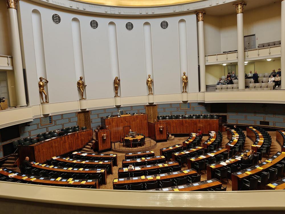 Sisälle Eduskuntaan meidät otettiin klo 14.45. Turvatarkastuksen jälkeen matkalaiset jaettiin kolmeen opastusryhmään. Saimme nähdä ja kuulla eduskuntatalon rakennushistoriasta pienoismalleina sekä talon ympärille ajansaatossa rakennettujen lisärakennusten käytöstä. Ennen kello 16.00 täysistuntosalissa alkavaa kyselytuntia, ryhmiä kierrätettiin marmorisia portaikkoja pitkin pääaulasta valtiosaliin. Pääaulassa on jokaiselle kansanedustajalle lokero, jossa voi säilyttää tavaroitaan työssäolo ajan. Lokerossa oleva postilaatikko jää nykyään käyttämättä. Posti kulkee sähköisesti. Valtiosalissa saimme kulkea entisten Suomen presidenttien kivisten katseiden seuraamina. Valtiosalin toisessa päässä sijaitsee se jokaisen tuntema eduskunnan hissi, hypätäkkö vai ei! Opas saatteli meidät täysistuntosaliin kuulemaan päivän kyselytuntia, jonka jälkeen tapasimme vielä kansanedustaja Matias Mäkysen SDP:n ryhmätilassa. Hän kertoi eduskuntaa puhuttavista ajankohtaisista teemoista. Lopuksi käytiin vielä keskustelua eläkeläisiä koskevista asioista.